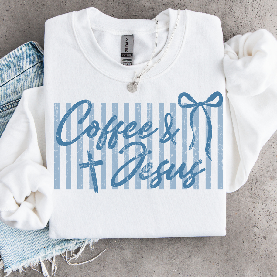 The Coffee & Jesus sweatshirt is for the girls who start their day with caffeine and Christ. Featuring soft blue script over subtle stripe detailing and a delicate bow accent, this piece blends cozy faith with a light, feminine aesthetic.