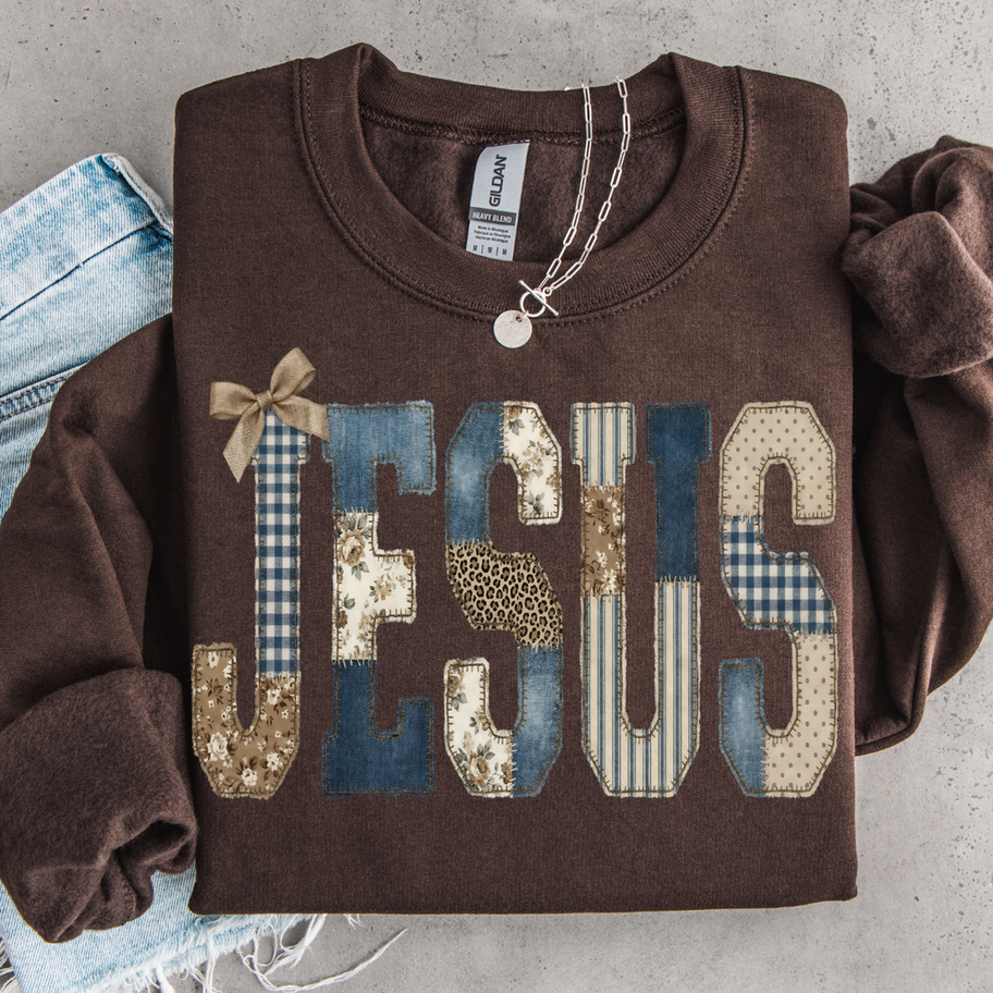 This cozy brown sweatshirt features a faux patchwork “JESUS” design that blends florals, denim textures, gingham, and neutral tones for a warm, vintage-inspired look.